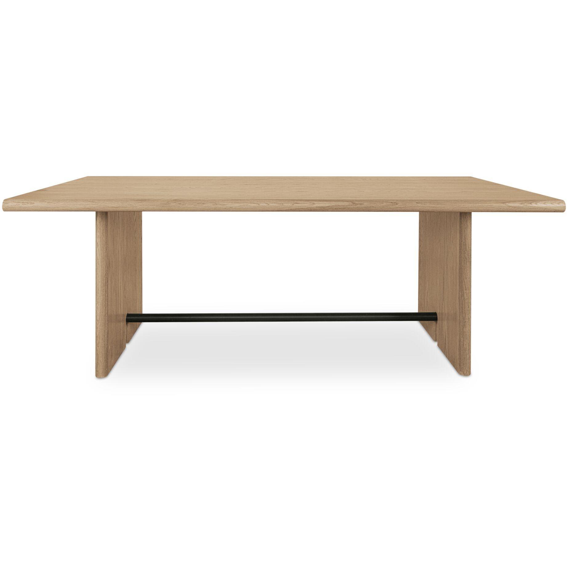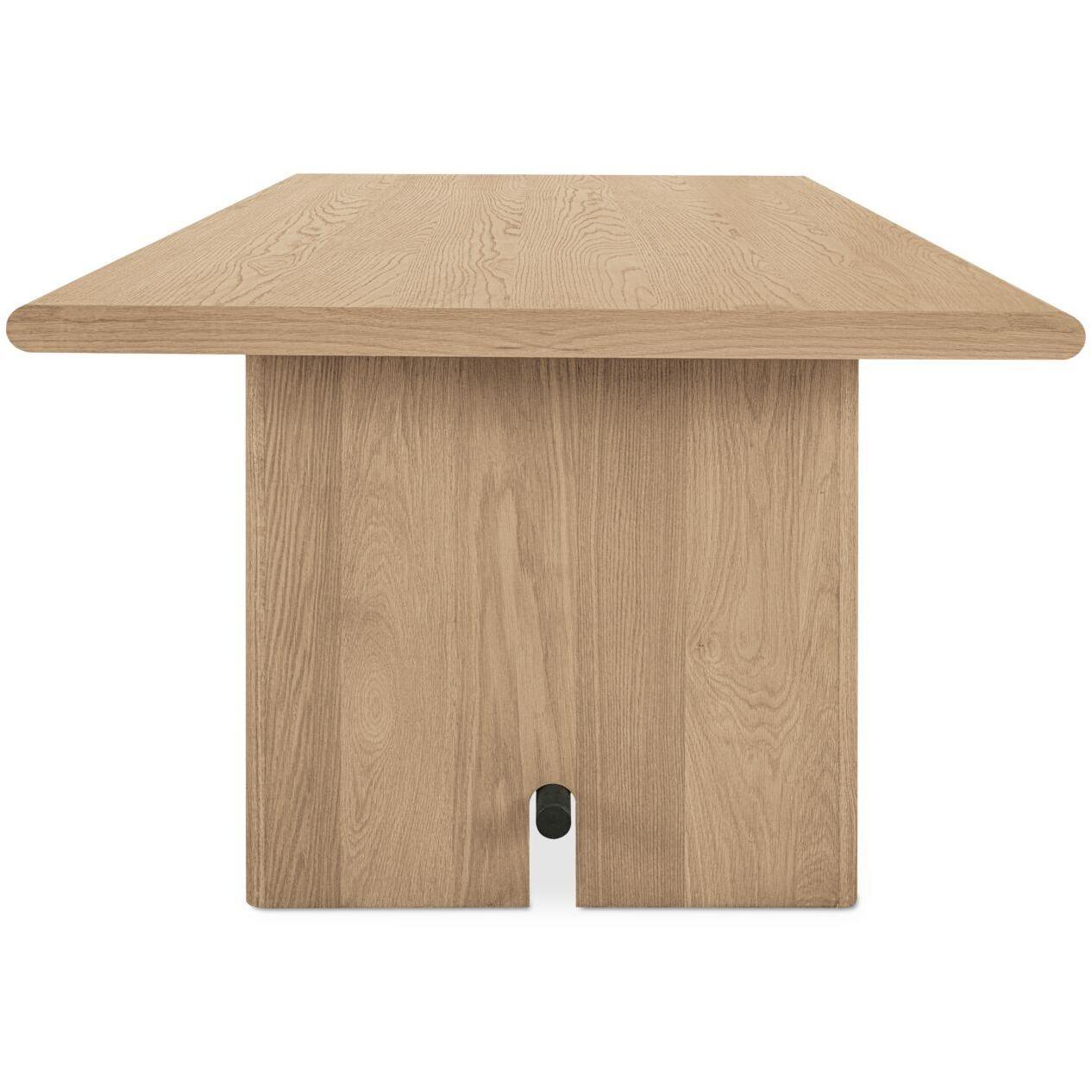 Crafted from solid oak and oak veneer, the Madison dining table’s tabletop features elegant bullnose edges along the length, juxtaposed with crisp edges on the shorter sides. The base mirrors this design, enhanced by graceful arched carvings and a blackened bronze metal bar.