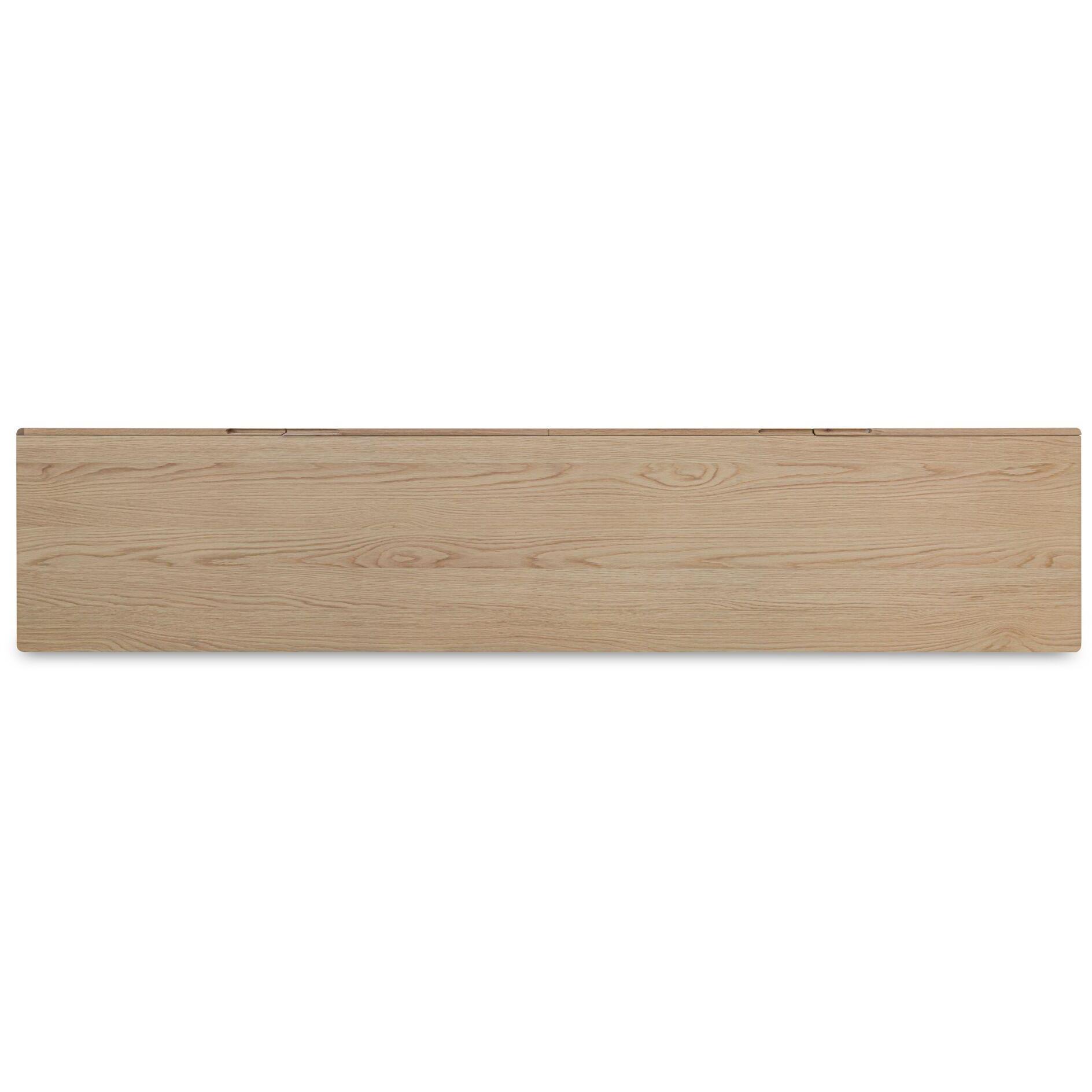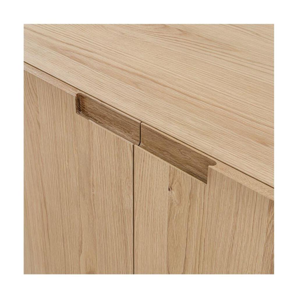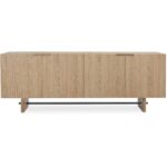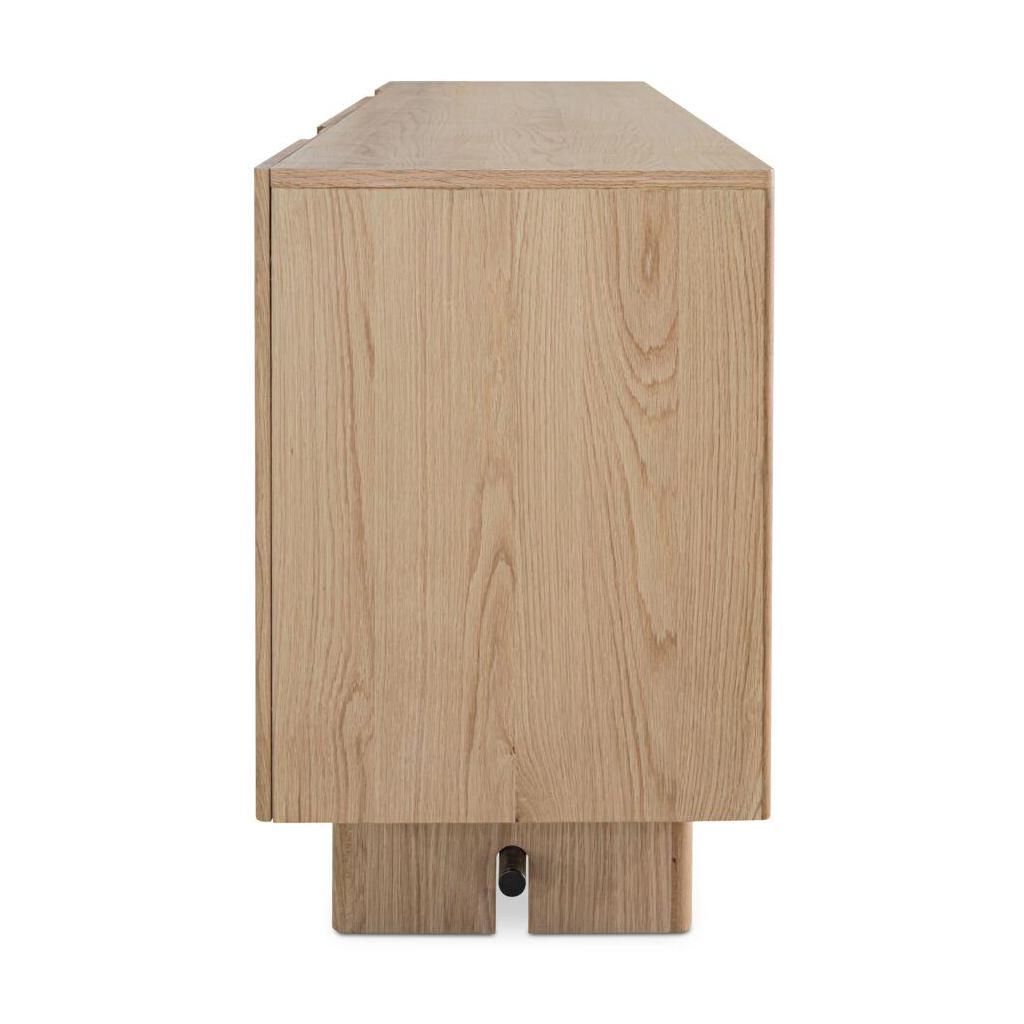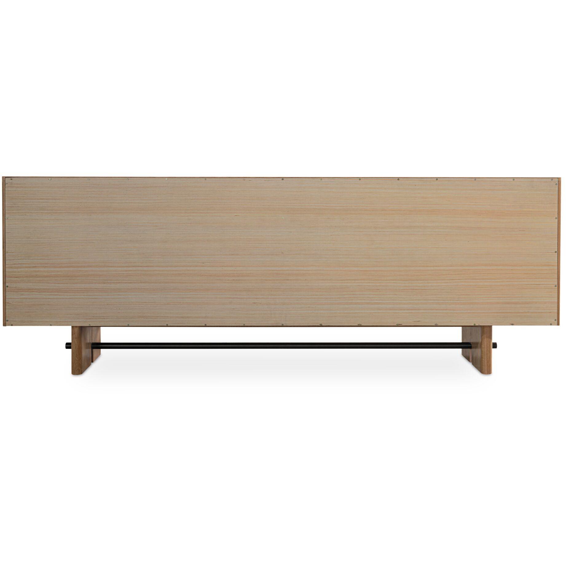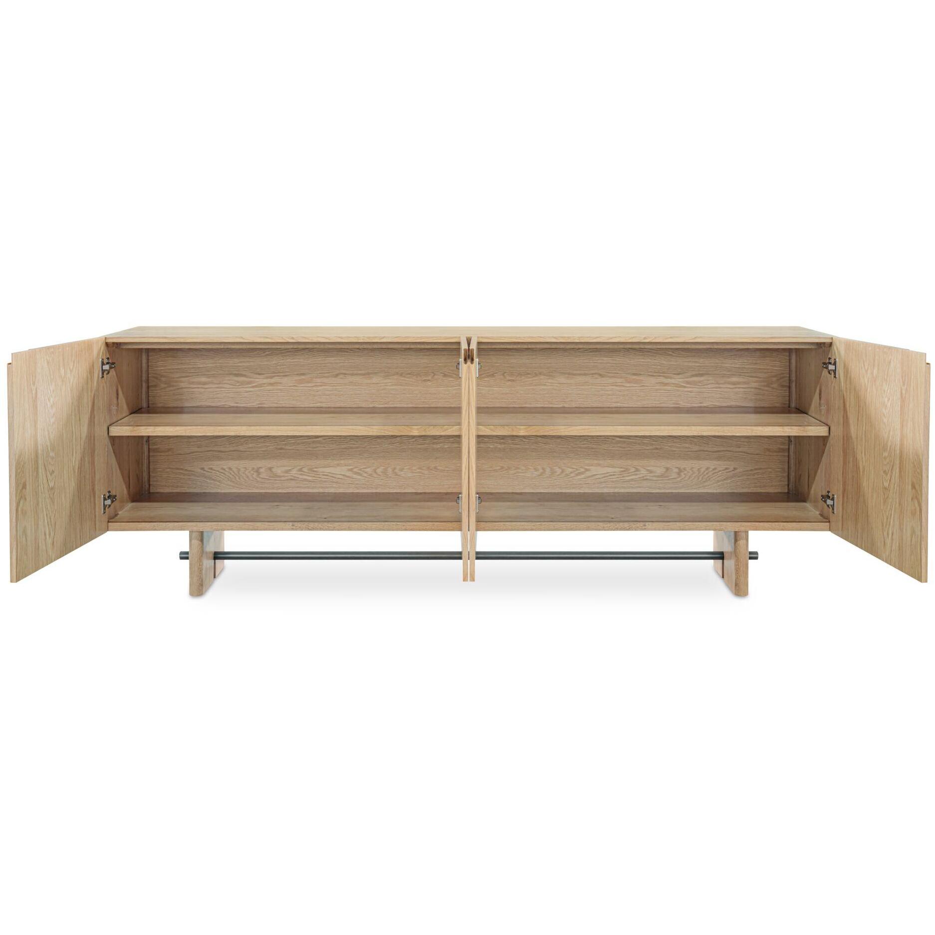 The Madison sideboard’s subtle carved handle along the rounded edge door frame maintains an uninterrupted facade, showcasing oak’s natural grain as it forms the tabletop and base edge. Arched leg carvings frame a blackened bronze metal bar.