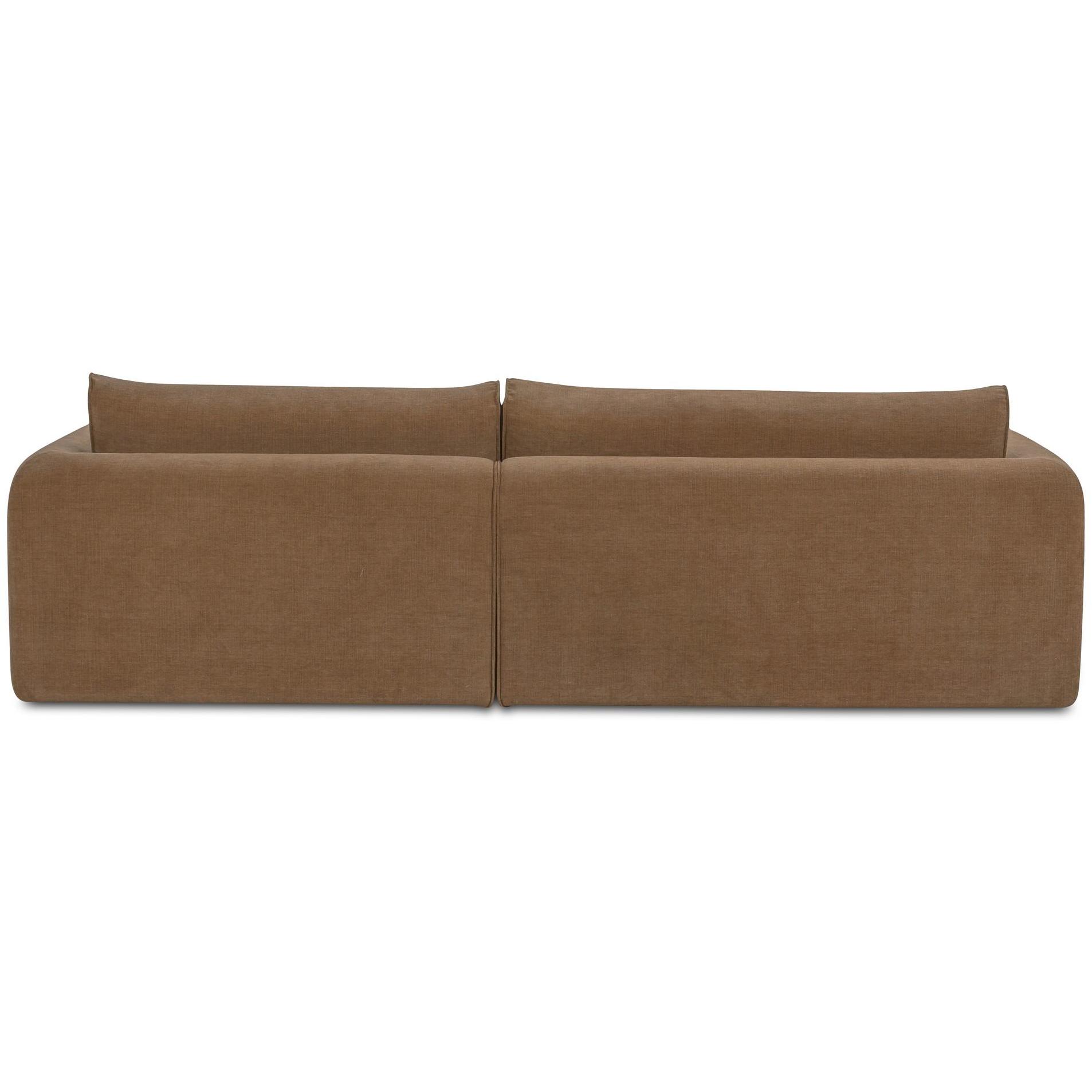 The Madrid sectional’s soft fabric upholstery and unique, angled wide chaise make it unlike any other silhouette. Soft, with a railroad weave, it invites the touch, while tonal piping draws the eye. A soft fixed seat and plush removable, reversible back cushions ensure lasting comfort and versatility.