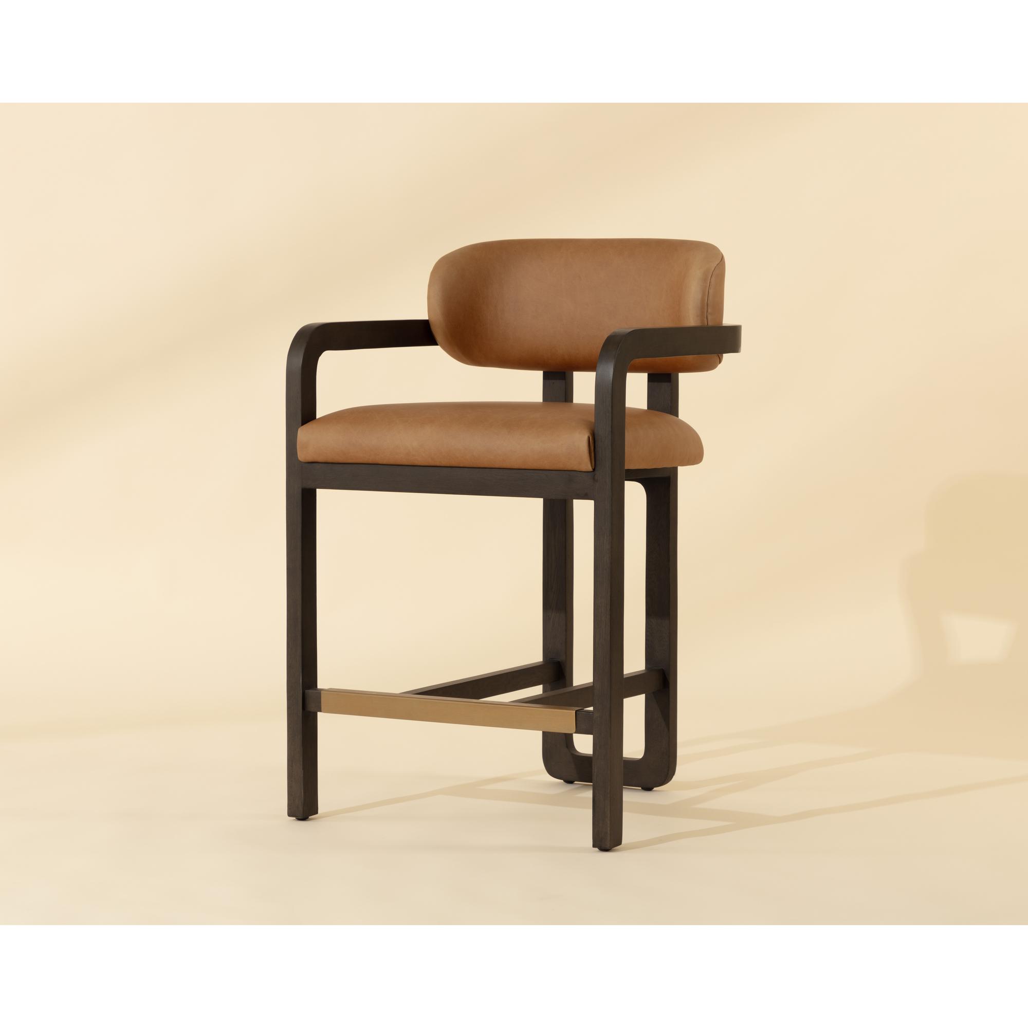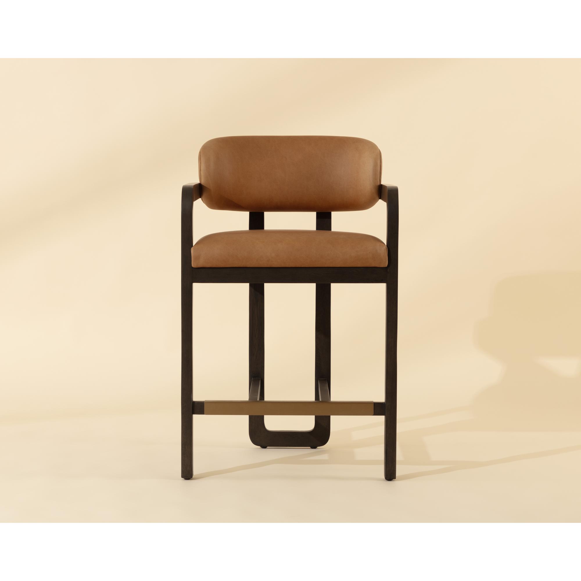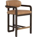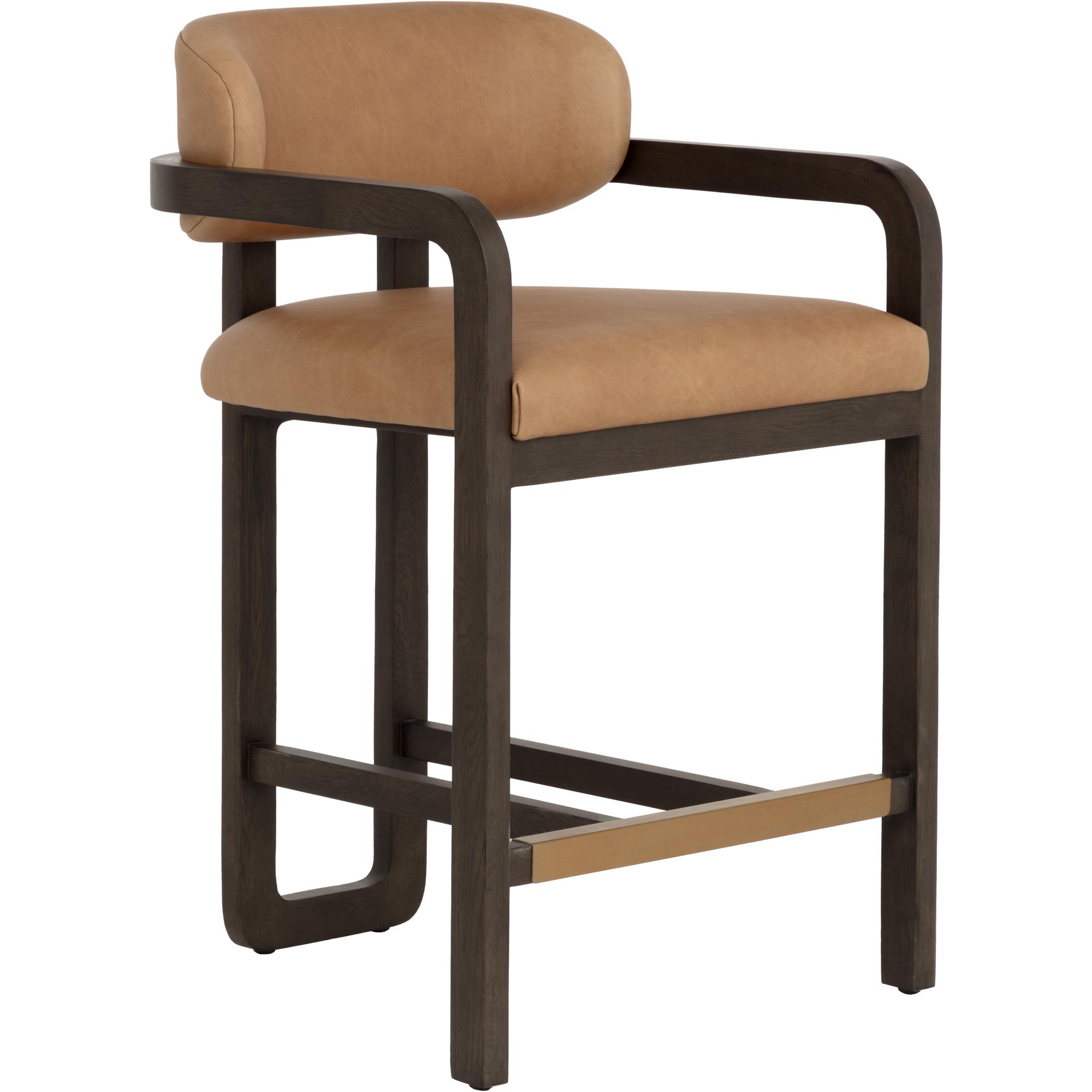 The eye-catching silhouette of the Madrone Counter Stool will stun from all angles. The curved lines of the three-legged brown oak wood frame lend a statuesque presence to any room. The low back seat is upholstered in ludlow sesame leather for luxurious comfort.