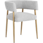 Turn heads with this contemporary dining armchair that exudes extravagance. Features a curved frame and upholstered in our belfast heather grey fabric and completed with antique brass legs. Also available in belfast heather grey fabric.