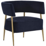 Turn heads with this contemporary lounge chair that exudes extravagance. Features a curved frame and upholstered in our danny navy and rust fabrics. Completed with antique brass legs. Also available in dove cream fabric.