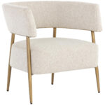 Turn heads with this contemporary lounge chair that exudes extravagance. Features a curved frame and upholstered in our dove cream fabric. Completed with antique brass legs. Also available in danny navy and rust fabrics.