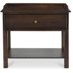 Staying true to traditional dimensions but elevated with leggy, modern proportions, the Maeve nightstand features distinctive lip detailing and an added shelf to harmonize its height. Crafted from mango wood and accented with brass-finished iron handles, it blends classic appeal with fresh touches for a sophisticated fusion.