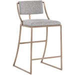Sleek with an urban design, this counter stool emulates a beautiful mid-century design. Upholstered in monument pebble and oatmeal fabrics, and completed with an antique brass stainless steel frame. Also available in a dining chair version.