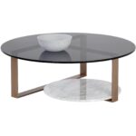 Boasting a striking form, this modern, round coffee table will elevate any space. Features a grey glass top with a round bottom base in white marble. Completed with an antique brass frame. As marble is a natural material, unique veining, pitting, fissures, micro-cracks and colour variations are all characteristics that add to the uniqueness and beauty of each piece.