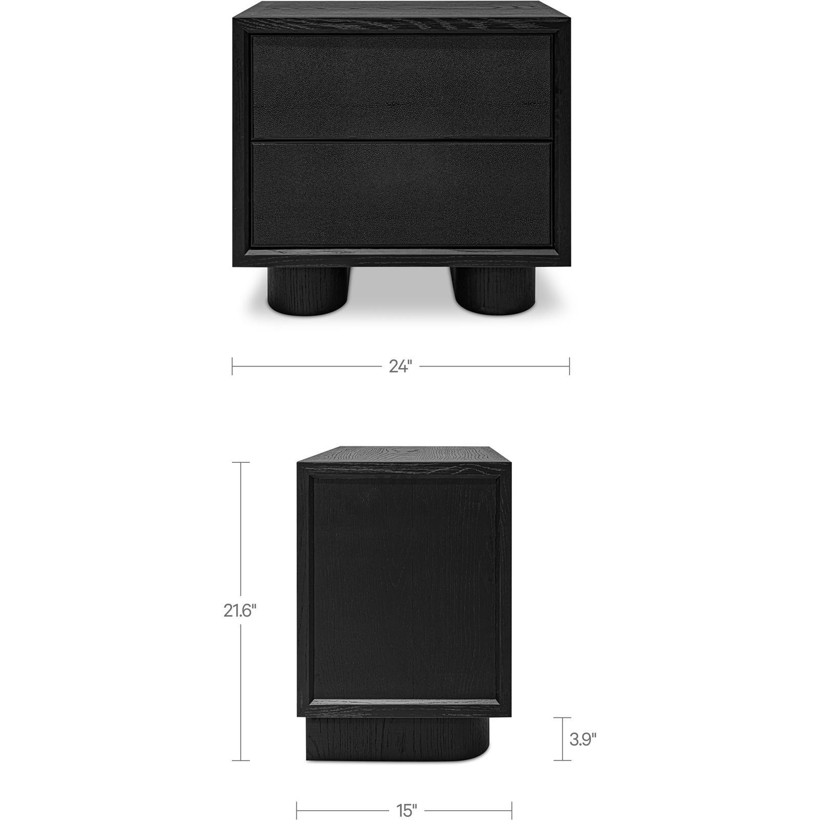 The Marcelle nightstand’s minimalist silhouette, enhanced by substantial legs, strikes a balance between sophistication and subtle playfulness. A showcase of craftsmanship, it features crafted wire-brushed oak and a shagreen door front framed by antique gold metal.