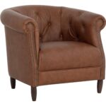The Marjorie Lounge Chair infuses modern warmth to the old-world charm of the chesterfield style. Expertly upholstered in a rich cognac shade of Italian bovine leather, it boasts aged copper nail heads that are applied by hand. With its masterfully rolled arms, this chair has a vintage appeal that will only flourish with time.