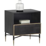 Influenced by global travels, skilled artisans use intricate woodworking techniques to bring the Markwood nightstand to life. The eye-catching dark brown mango wood and antique brass frame result in a modern look. Features shelving and a drawer for ample storage.