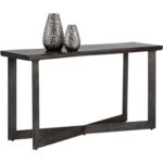 This console table combines rustic and industrial elements perfect for transitional spaces. Featuring a solid acacia wood top in a rich walnut brown finish, with a contrasting antique gunmetal steel base. As wood is an organic, porous material, these pieces will contain natural variation of texture and may also exhibit fine indentations and cracks. Wood pieces will also display a disparity of colour and grain, and visible knots and burls that add to the character of each piece.