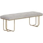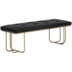 This stylish bench will provide additional seating to living and lounge spaces. Features a tufted seat in clover green and eclipse white fabric with curved black iron legs.