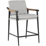 Functional with a timeless design, this mid-century style counter stool offers a clean silhouette that will suit any space. Stocked in vault fog fabric with solid oak wood armrests. Completed with a black iron frame. Also available in a dining armchair and lounge chair version. Performance fabric is moisture repellent, durable and easy to clean. As wood is an organic, porous material, these pieces will contain natural variations of texture and may also exhibit fine indentations and cracks. Wood pieces will also display a disparity of colour and grain, and visible knots and burls that add to the character of each piece.