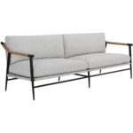 Functional with a timeless design, this mid-century style sofa offers a clean silhouette that will suit any space. Stocked in vault fog fabric with solid oak wood armrests. Completed with a black iron frame. Also available in a counter stool and dining armchair version. Performance fabric is moisture repellent, durable and easy to clean. As wood is an organic, porous material, these pieces will contain natural variations of texture and may also exhibit fine indentations and cracks. Wood pieces will also display a disparity of colour and grain, and visible knots and burls that add to the character of each piece.