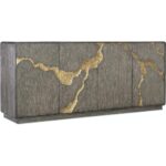 - Finish: Dark oak veneers with gold colored “fissure” motif across door fronts. Olive green painted interior.