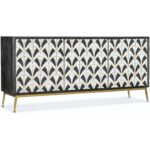 - Finish: Black wood finish with white, beige and brown bone inlay on door fronts. Gold metal base and legs.