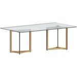 A set of modern and triangular table bases featuring powder coated steel frames in gold, complemented with solid oak wood. Intended for use with a 96″ glass top for a rectangular dining table combination. Table top sold separately. Designed for use with glass table tops only.