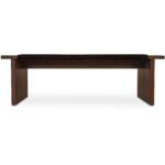 The Merritt outdoor bench blends indoor refinement with outdoor durability. This versatile bench features a solid teak frame complemented by woven, twisted synthetic hyacinth. The dark brown finish adds a touch of sophistication to any setting. Suitable for both outdoor use and as an entryway bench, it provides stylish seating and a subtle textural element to elevate any space.