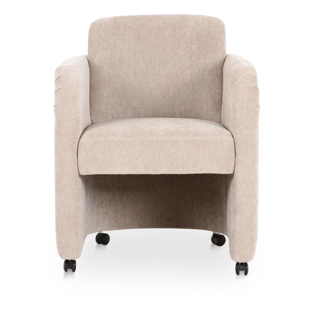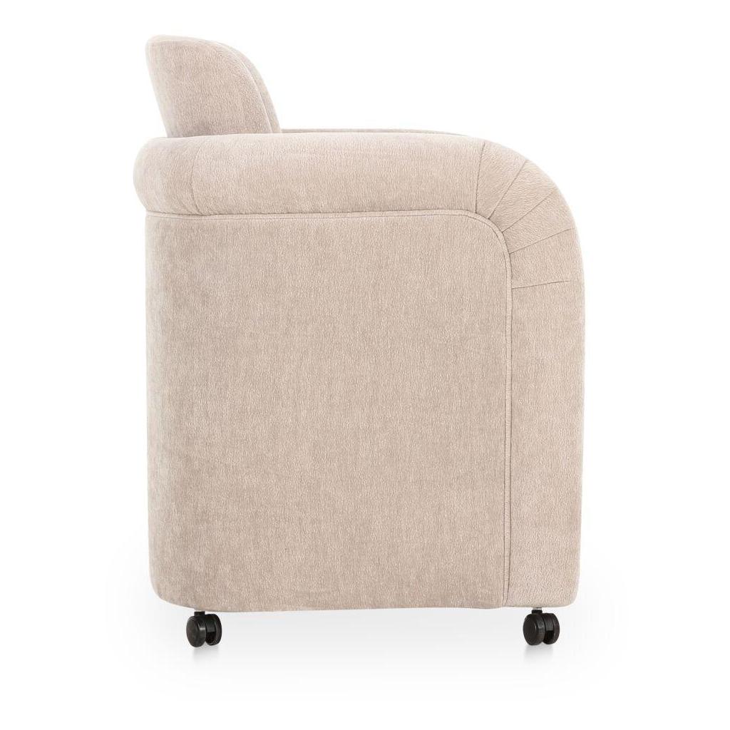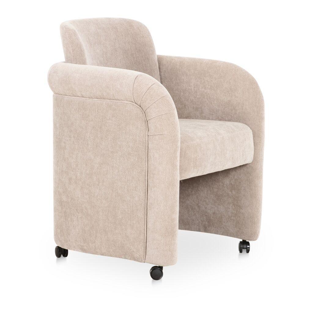 The Mesto dining chair encapsulates the essence of comfort-driven coziness. It features a well-padded seat that seems to float between an elegantly arched, curved, upholstered frame and a rolling base that can be replaced with included plastic legs to create stationary seating. The arms pay homage to traditional English roll styles with pleated details, blending classic craftsmanship with modern aesthetics, while the soft, textured upholstery adds a gentle, inviting touch to any space.