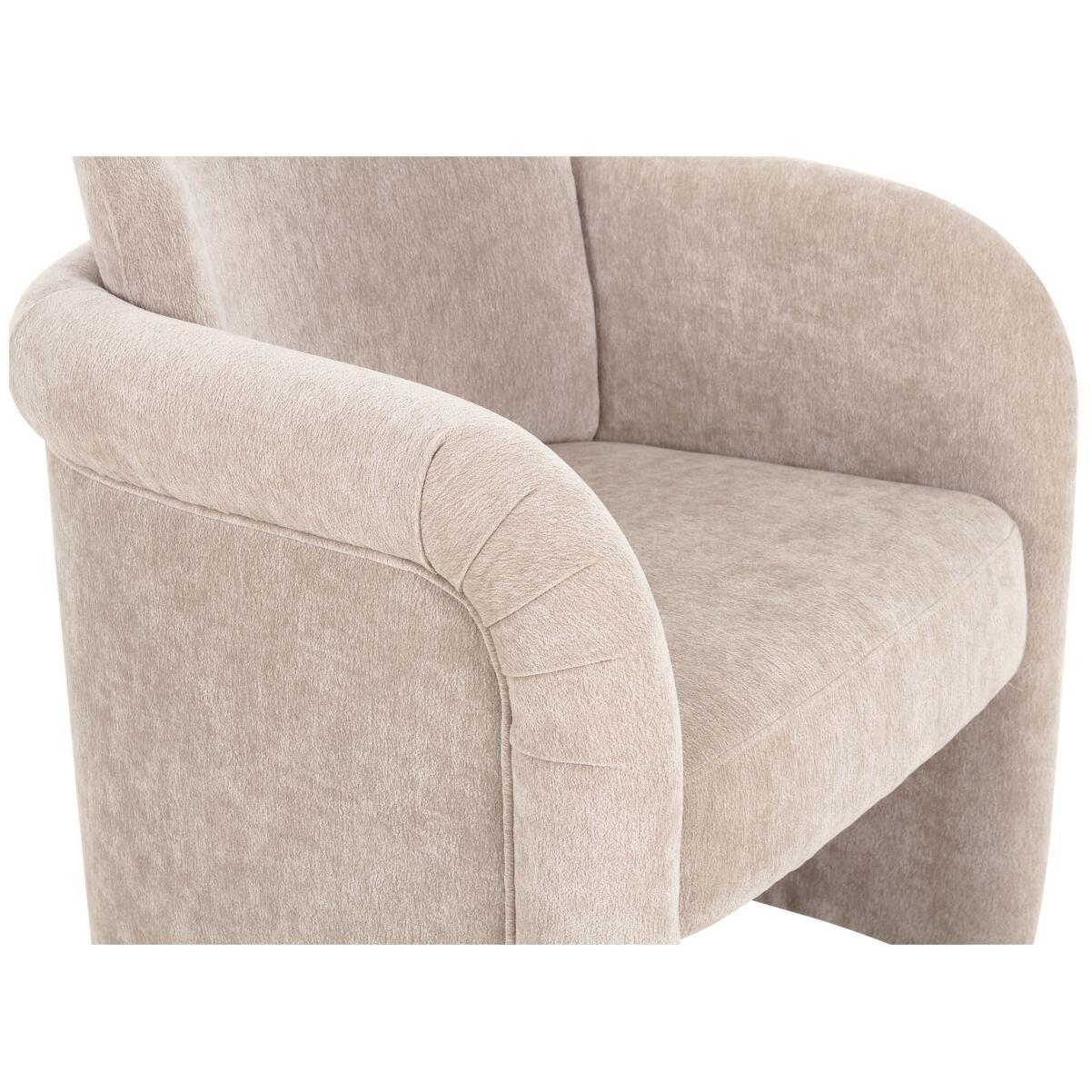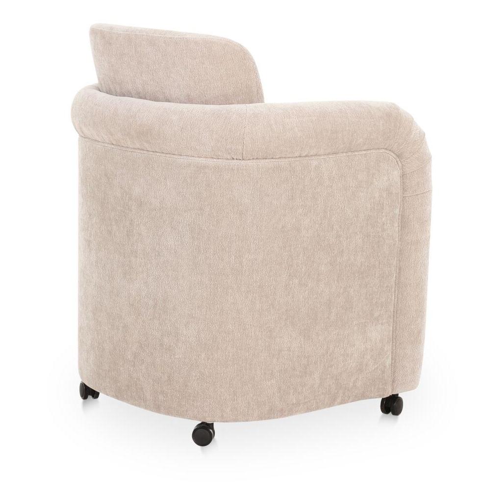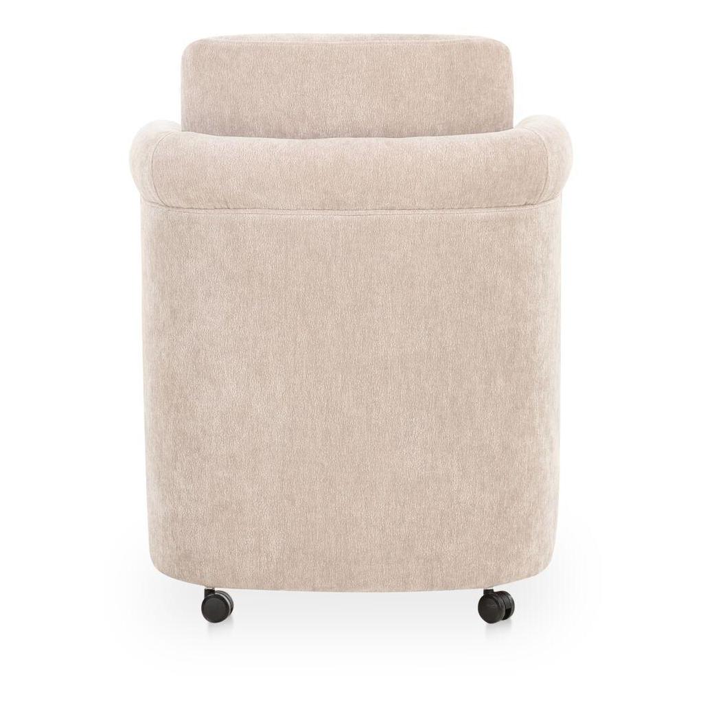 The Mesto dining chair encapsulates the essence of comfort-driven coziness. It features a well-padded seat that seems to float between an elegantly arched, curved, upholstered frame and a rolling base that can be replaced with included plastic legs to create stationary seating. The arms pay homage to traditional English roll styles with pleated details, blending classic craftsmanship with modern aesthetics, while the soft, textured upholstery adds a gentle, inviting touch to any space.