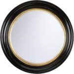 This round Regency-style mirror features a wooden frame finished in sleek black with elegant gold detailing. Its timeless design and refined accents make it a sophisticated addition to any classic or modern space.