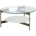 A tiered coffee table which features a rich combination of materials, resulting in a spectacular appearance. Features a round, clear tempered glass top with a white marble shelf for added storage and decor display. Completed with a hammered iron frame in an antique brass finish. Made in India. With refined craftsmanship, this design was brought to life by skilled local artisans. By nature, these materials develop unique imperfections such as fissures, markings and colour variations for a truly one-of-a-kind piece.