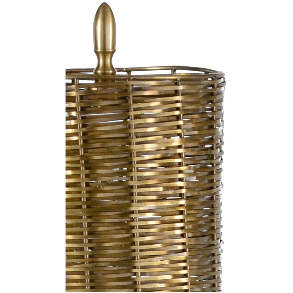Enhance the modern aura in your home with Milo Lamp. Perfect for a small space, this brass lamp features a minimalist design with an intricate shade. The simple brass column is supported by a natural black marble base and is topped with a woven tarnished brass finished metal shade (Shade: 5″d x 5.5h)