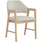 Chic and charming, this dining armchair has a blissful mid-century modern design with understated details. Stocked in meg dusty teal fabric with a solid rubberwood frame in a smoke acacia finish. Completed with antique brass stretchers. Also available in mina ivory fabric. Light wash finish also available.