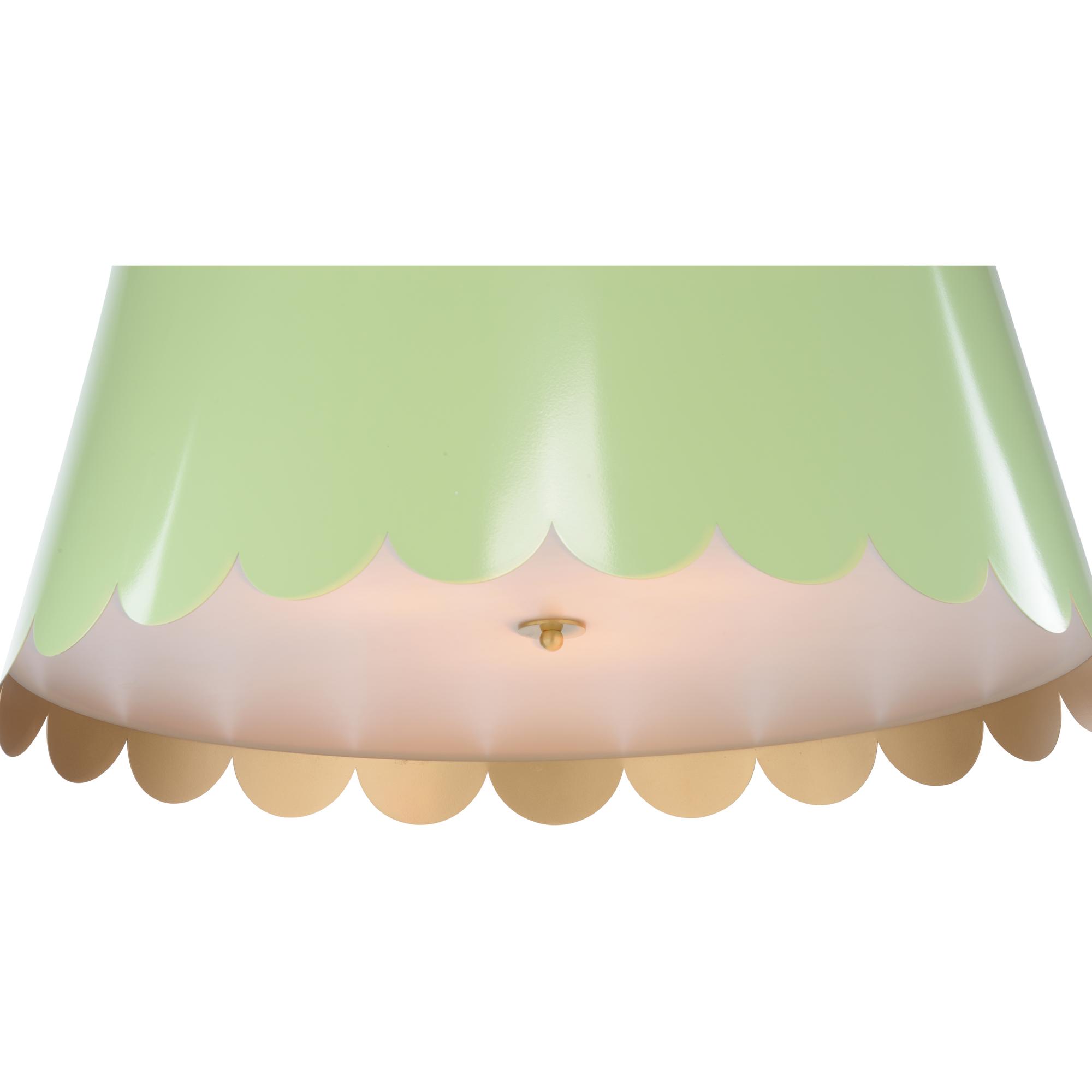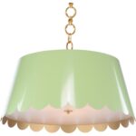 Designed for Wildwood by Meg Braff Designs, this sleek pendant features a playful scalloped detailing suspended from a white chain. (Inside of shade is gold). Mirasol pendant has three lights that will brighten a kitchen, sunroom or foyer. Comes with a 5″ canopy and 6′ of chain.