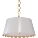 Designed for Wildwood by Meg Braff Designs, this sleek pendant features a playful scalloped detailing suspended from a white chain. (Inside of shade is gold). Mirasol pendant has two lights that will brighten a child’s room, breakfast nook or small foyer. Comes with a 5″ canopy and 6′ chain.