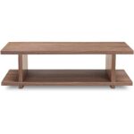 The Miri coffee table features an open-shelf design with ample storage, celebrating mid-century modern style fused with practical functionality. Its timeless and foundational structure is effortlessly adaptable, complementing diverse interior styles. Its versatile walnut-tone finish allows it to integrate seamlessly into any color scheme.