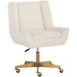 Add a hint of modern glamour to any workspace with this grand office chair. Stocked in zenith alabaster performance fabric. Completed with a matte gold stainless steel base with added castors for mobility. Performance fabric is moisture repellent, durable and easy to clean.