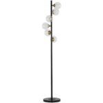 Set the mood with this modern floor lamp. This design features six globes with brass bases spiraling around a black iron pole with a black marble base. As marble is a natural material, unique veining, pitting, fissures, micro-cracks and colour variations are all characteristics that add to the uniqueness and beauty of each piece.