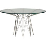 An airy yet intricate silver base paired with a round glass top define the Axel Round Dining Table, a stylish statement piece unique in silhouette and sleek in material.