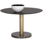 This dining table collection offers a modern look with an organic feel. Features a substantial light grey marble and brushed gold iron base with a charcoal grey finished oak wood veneer top. As marble is a natural material, unique veining, pitting, fissures, micro-cracks and colour variations are all characteristics that add to the uniqueness and beauty of each piece. As wood is an organic, porous material, these pieces will contain natural variation of texture and may also exhibit fine indentations and cracks. Wood pieces will also display a disparity of colour and grain, and visible knots and burls that add to the character of each piece.