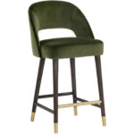 A chic barrel back counter stool with vintage influence. Crafted with a soft, abbington black fabric. Also available in moss green velvet fabric, or bravo cream faux leather seat and exterior with a polo club muslin seatback. Finished with brown birch wood legs and antique brass caps. Suitable for various dining, kitchen and bar spaces of all sizes.