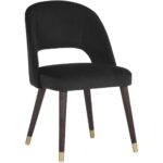 A chic barrel back dining chair with vintage influence. Crafted with abbington black fabric and finished with brown birch wood legs and antique brass caps. Suitable for various dining and kitchen spaces of all sizes. Also available in bravo cream faux leather with polo club muslin fabric.
