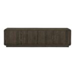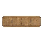 Earthy, rustic style has been rounded into a minimal silhouette with the Monterey media cabinet. A gently curved showcase with a fully finished back, this dining credenza features richly finished pinewood with a blocked base design, four interior cut-outs for complete cable management and four magnetic catch doors revealing broad storage sections and adjustable interior shelving.