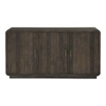 Earthy, on-trend rustic style has been rounded into a minimal silhouette with the Monterey dining credenza. This sideboard features richly finished pinewood with a matte, driftwood-like finish and blocked base design. With three magnetic catch doors revealing six sleek storage sections + adjustable interior shelving, this storage buffet is a rustic knock-out retreat for all your dining essentials. A gently curved showcase with a fully finished back, this darkly warming beauty makes for an elegant design off to the side or displayed as a focal point with its confident finish.