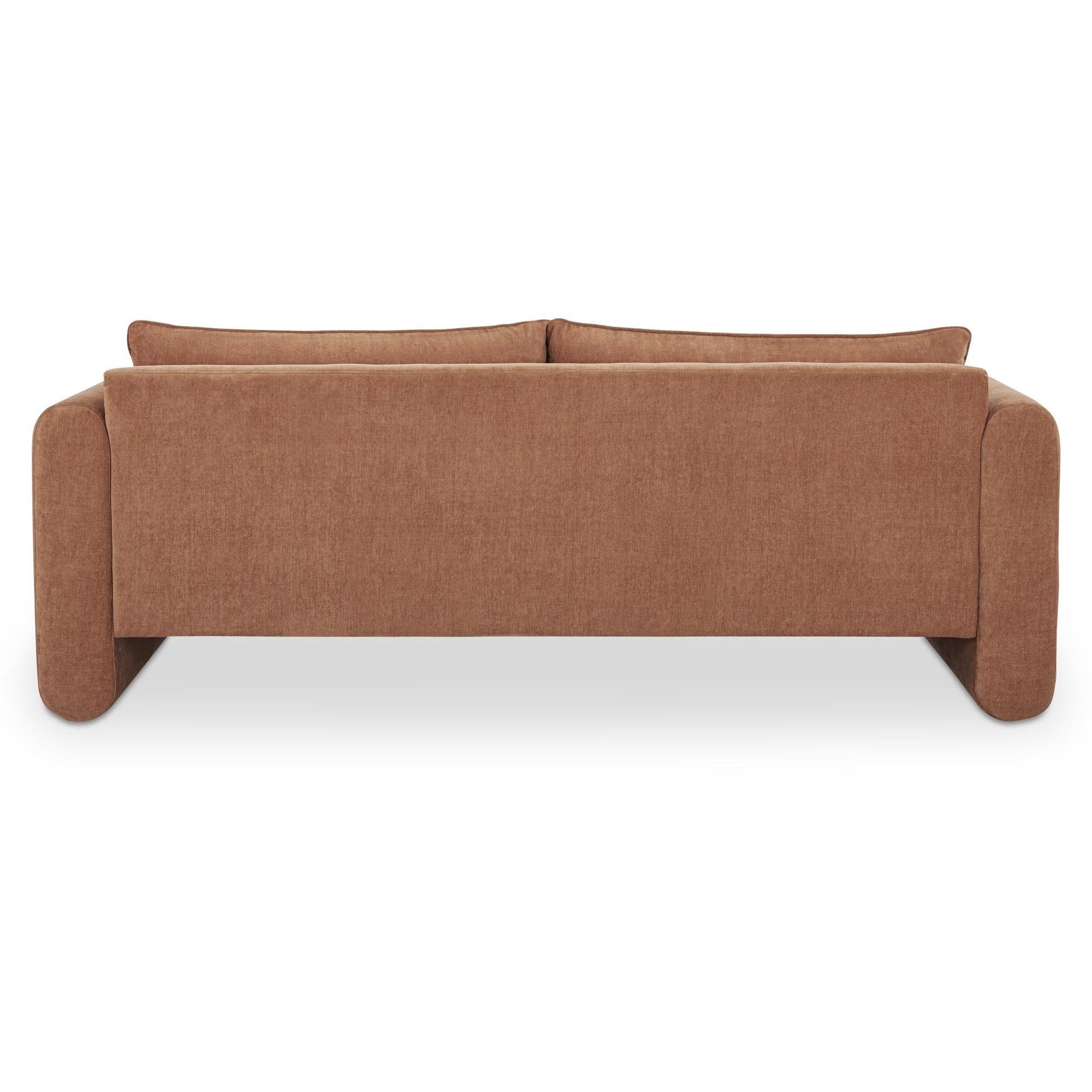 Smaller scale, bigger impact—the Moore Sofa is made for secondary spaces and apartments that deserve comfort. Curved arms and a raised seat keep the profile light, while wide arms and removable cushions make lounging easy. Upholstered in heritage pink polyester with a washed linen-like texture, it adds a sun-faded, nostalgic warmth. A fixed bench and supportive foam-and-fiber cushioning ensure Moore looks as good as it feels—day after day.