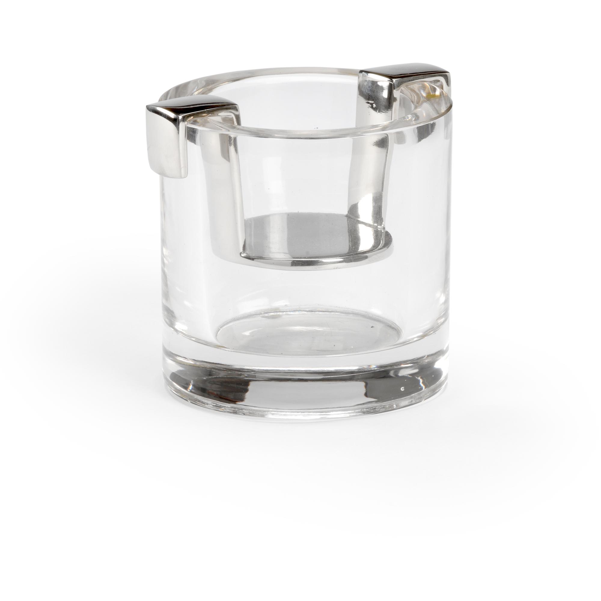 Beautiful floating votive candle holder in polished brass suspended in a glass vase.