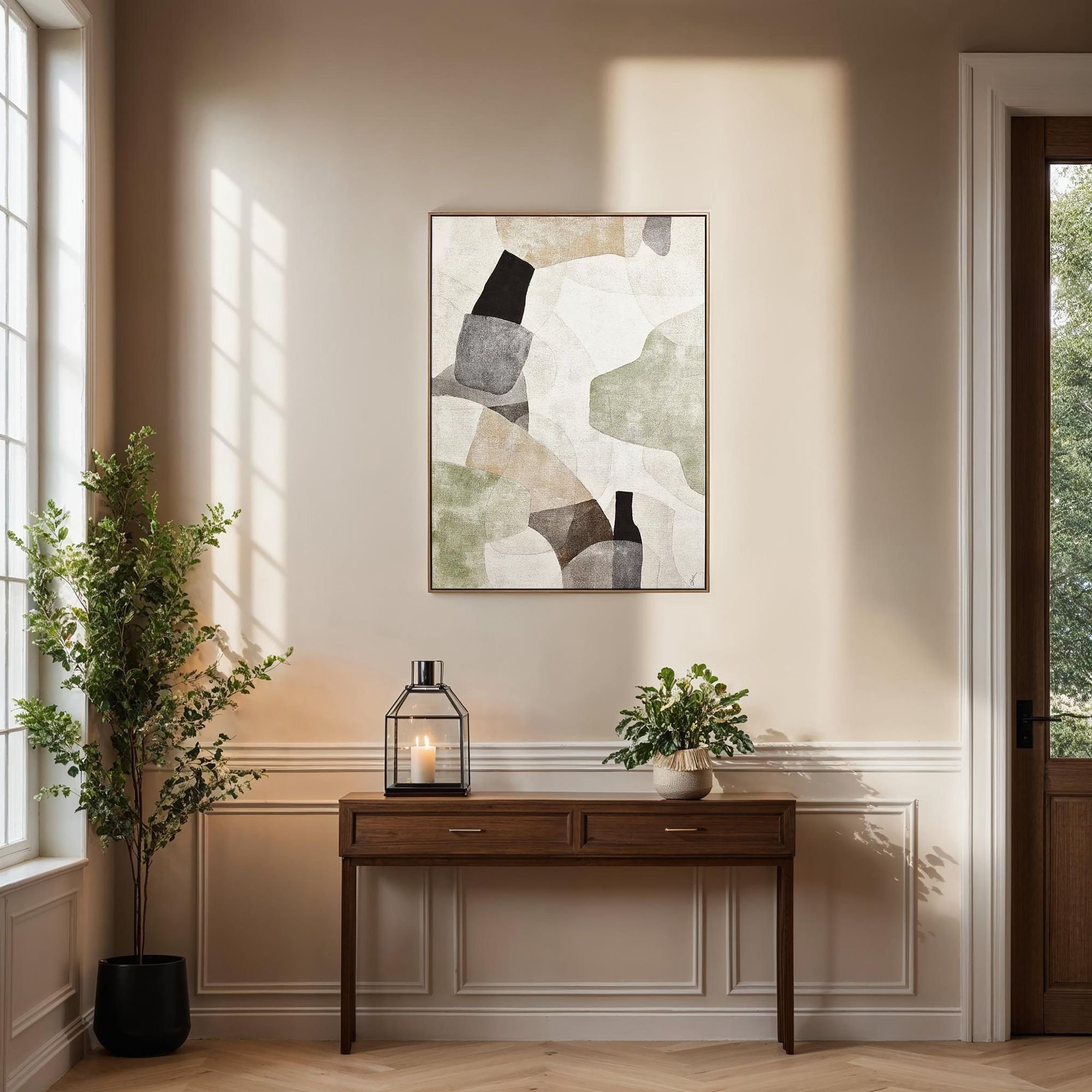 In a study of shape and colour, this eye-catching wall art is ready to serve as a focal point in your next design project. Neutral hues come to life in soft textures, hand-applied with a dry brush technique for an artisanal, one-of-a-kind effect. Finished with a new bleached wood frame, this abstract painting will bring an instantly modern update to any space.