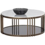 Introduce an element of grandeur to any space with this marvelous coffee table. Features a 21mm solid Carrara white marble top with a 6mm smoked tempered glass bottom. Completed with a stylish metal frame in a rustic bronze finish. Coordinating console and end tables also available. As marble is a natural material, unique veining, pitting, fissures, micro-cracks and colour variations are all characteristics that add to the uniqueness and beauty of each piece.