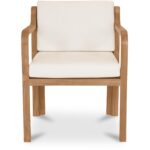 The Nellie outdoor dining chair elevates outdoor dining with comfort and enduring style. This foundational piece features a solid teak frame with quick-dry foam cushions upholstered in white 100% Olefin fabric. The curved back with gradually sloping arms creates a welcoming silhouette whose form is durable and weather resistant.