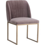 A transitional dining chair that offers style and comfort. Features delicate ruching on the rounded seatback and exposed antique brass legs. Stocked in shadow grey fabric.