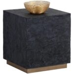 A bold concrete end table. Features an intricately crafted black or brown slate effect finish and completed with a 2″ brushed brass base. Crafted from a natural concrete mix, each piece will look different. Variations in colour, texture, imperfections, surface scratches and non-structural hairline cracks are considered inherent and valued qualities of the material.