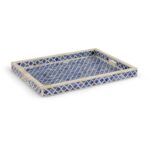 Serve drinks at your next casual dinner party with newton tray. Crafted in wood with a blue and white bone inlay, it features a quatrefoil design that is sure to catch the eye of your guests. This tray may also be used on an ottoman to hold your favorite magazine and the remote control.