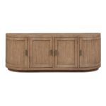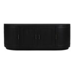 A blend of modern and vintage with its contemporary silhouette, the Nicola media cabinet features curved doors that smooth the bold textures of reclaimed wood. Its striking form stands on a recessed base, offering a stark contrast that beautifully complements transitional settings. The minimalist handle detail emphasizes the piece’s elegant curves, while ample storage simplifies the organization of media essentials inside.