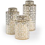 Noble Canisters make an elegant decorative accent for any home. The set of three white glazed porcelain canisters feature a metallic gold geometric pattern, adding visual interest to the decor. Canisters may be used as a set to make a bold centerpiece or they may be used throughout the home to bring cohesion to your design style. Small-10.5″h 7″w 7″d Med- 13″h 7″w 7″d Large-16″h 7″w 7″d