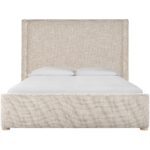 Featuring an extra-tall backboard, the Upholstered Shelter Bed makes a statement full of texture with a woven-inspired body and subtle circular legs.