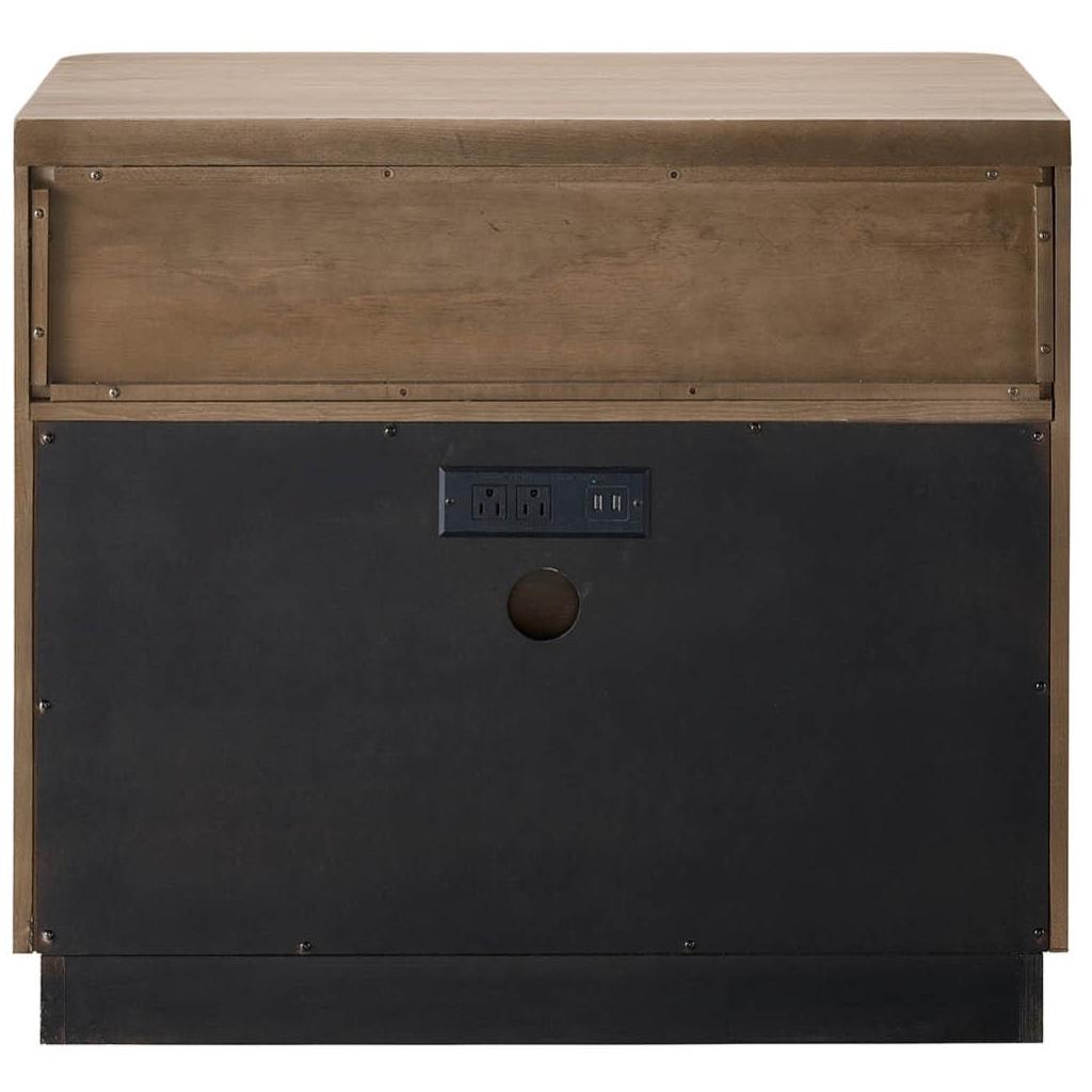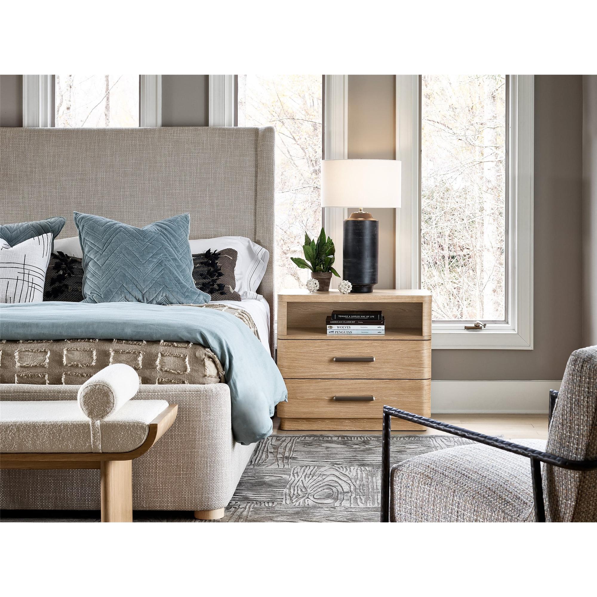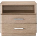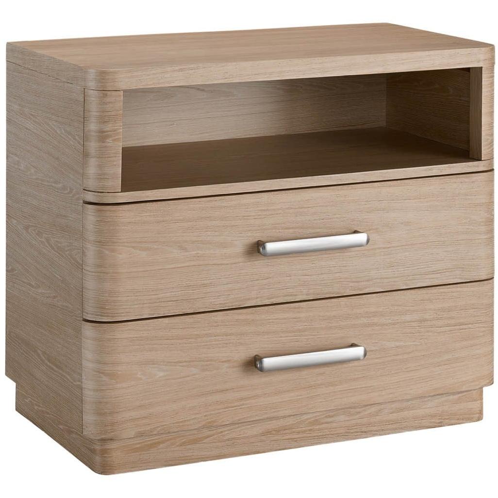 Bring a natural touch to bedsides with the Nightstand, a fresh oak-finished piece built with two drawers, an open-air shelving display and modern bar hardware.